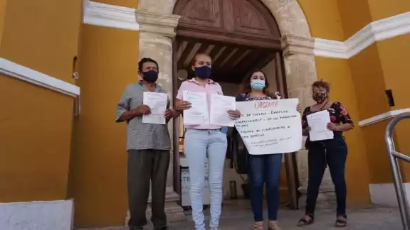 Trabajadores del ayuntamiento adscritos a la comisaría de Chiná se manifestaron en el acceso principal de el ayuntamiento de Campeche para exigir el pago de sus honorarios correspondientes a un mes de trabajo.