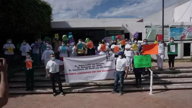 Personal de salud, entre médicos, enfermeros y enfermeras, de la Unidad Médica Familiar número 11 del IMSS ubicada en la novia del mar se manifestaron para solicitar que también sean considerados en la aplicación de la vacuna contra el COVID-19.