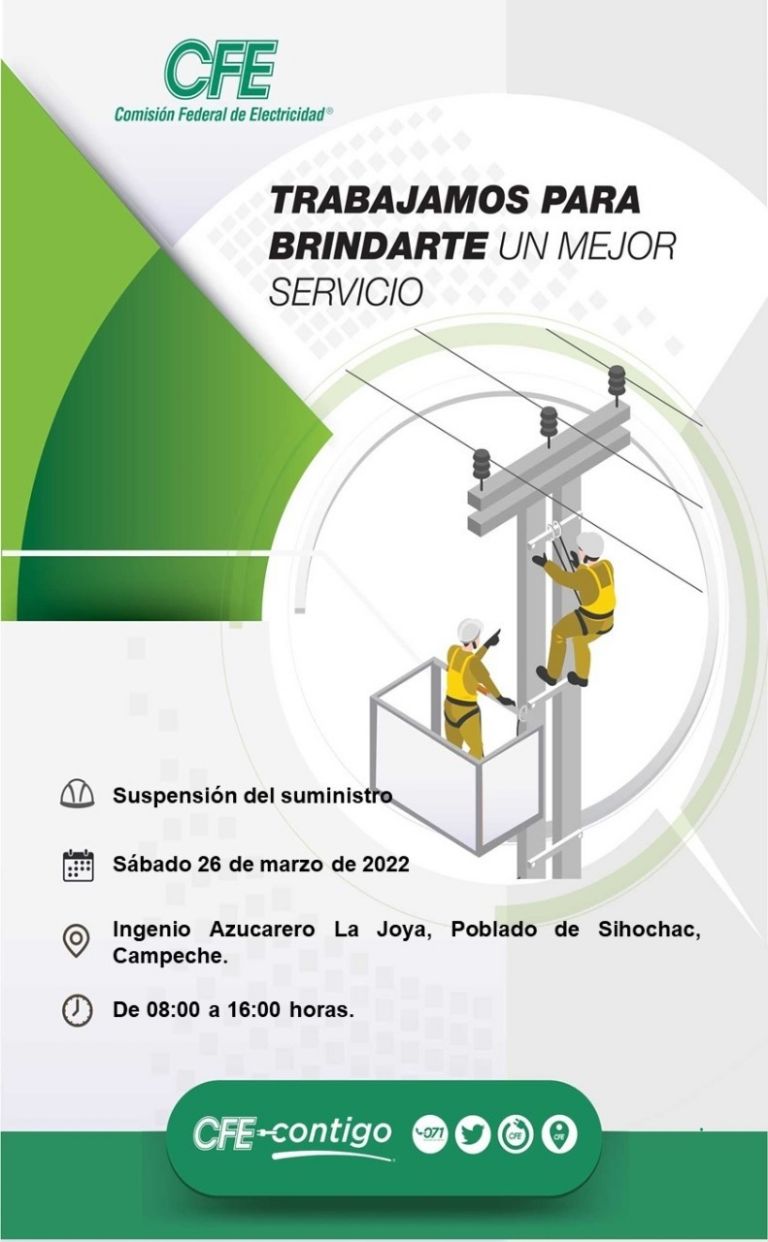 En Ingenio Azucarero, Campeche, sufrirán la suspensión de la energía por casi ocho horas debido a los trabajos de rehabilitación de la CFE en el Estado