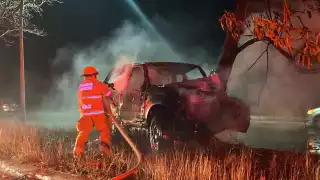 Camioneta se calcina tras chocar contra un árbol en Campeche