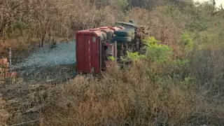 Conductor pierde el control y vuelca con camión de material en Villamar, Champotón