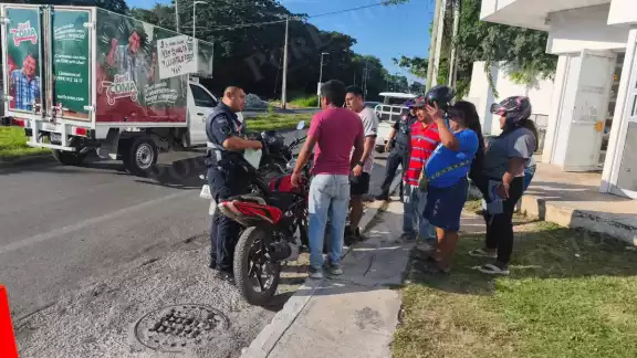 Camioneta de CFE provoca derrape de motociclista en Escárcega; una mujer resulta herida