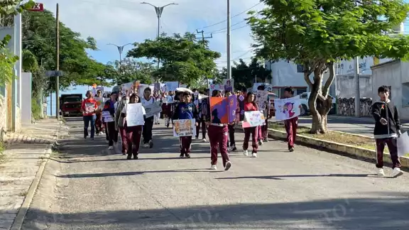 Alumnos de la escuela secundaria general 04 "Dr. Luis Álvarez Buela" de la ciudad de Hopelchén, desfilaron con carteles alusivos con motivo del Día Internacional de la Erradicación de la Violencia contra las Mujeres y Niñas, en donde plasmaron sus pensamientos para evitar que las féminas sean violentadas.