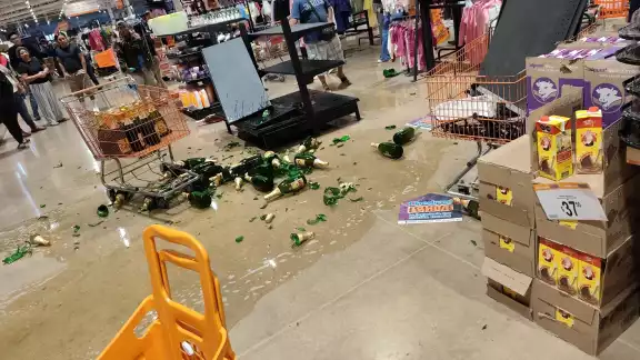 De acuerdo con imágenes captadas por una usuaria, más de 10 botellas de sidra terminaron estrelladas dentro del área de ventas, provocando una escena de vidrios rotos y líquido derramado, lo que generó desorden momentáneo en el establecimiento, uno de los más concurridos en estas fechas.