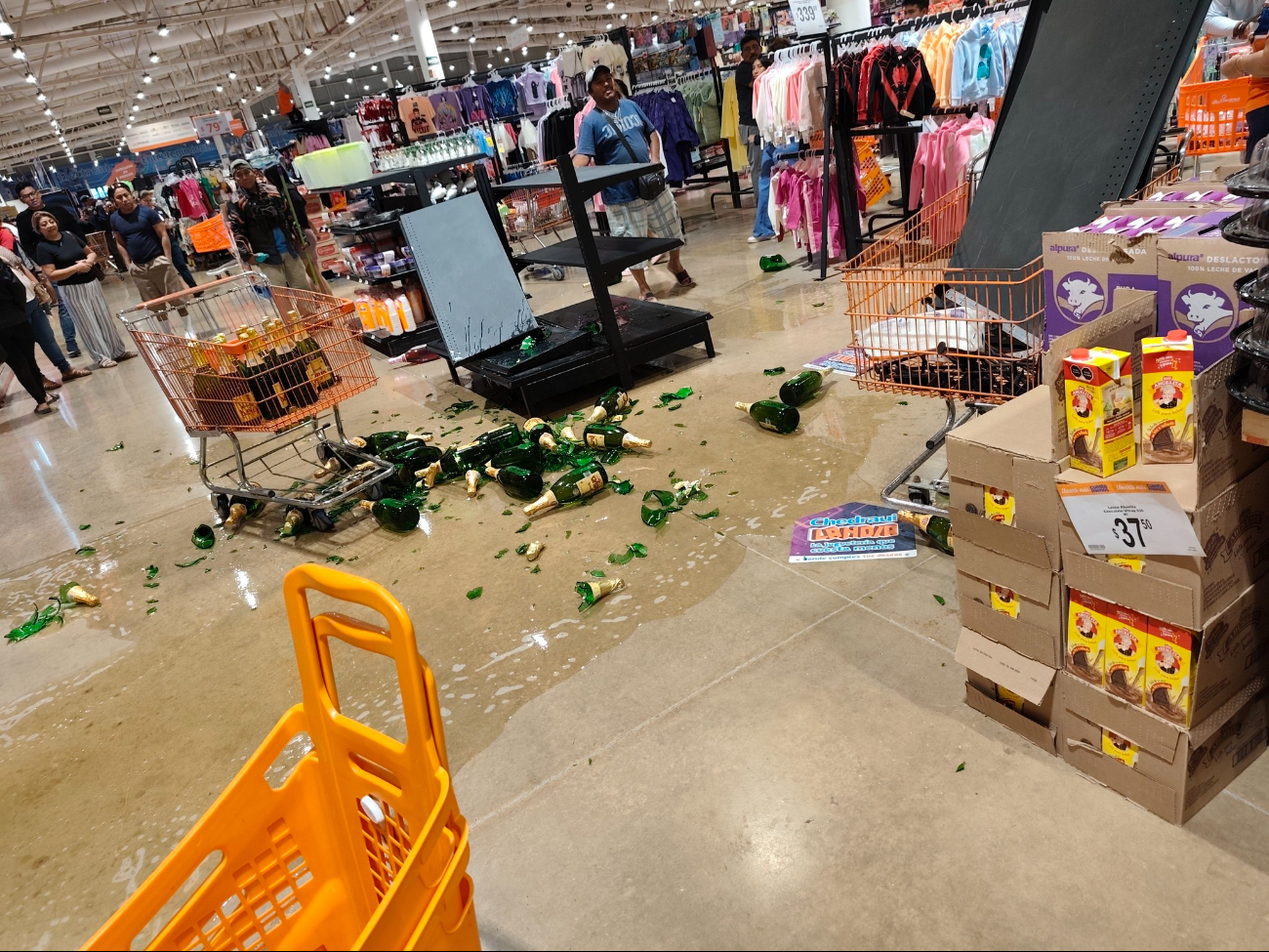 De acuerdo con imágenes captadas por una usuaria, más de 10 botellas de sidra terminaron estrelladas dentro del área de ventas, provocando una escena de vidrios rotos y líquido derramado, lo que generó desorden momentáneo en el establecimiento, uno de los más concurridos en estas fechas.