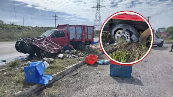 La mañana de este miércoles se registró un aparatoso accidente sobre el kilómetro 28 del tramo carretero Isla Aguada–Ciudad del Carmen, donde una camioneta cargada con tonelada y media de jaiba volcó tras el estallido de un neumático.