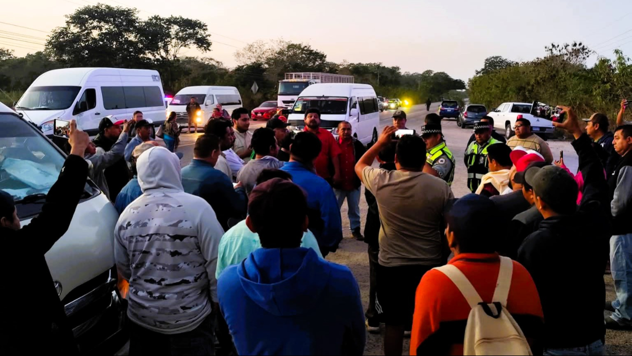 Por ello, la carretera federal antigua Campeche–Mérida fue bloqueada por más de una hora, y se detenía principalmente a taxis de color rojo. Al arribar la Guardia Nacional, se solicitó la documentación y se confirmó que las unidades tenían los tarjetones vencidos.
