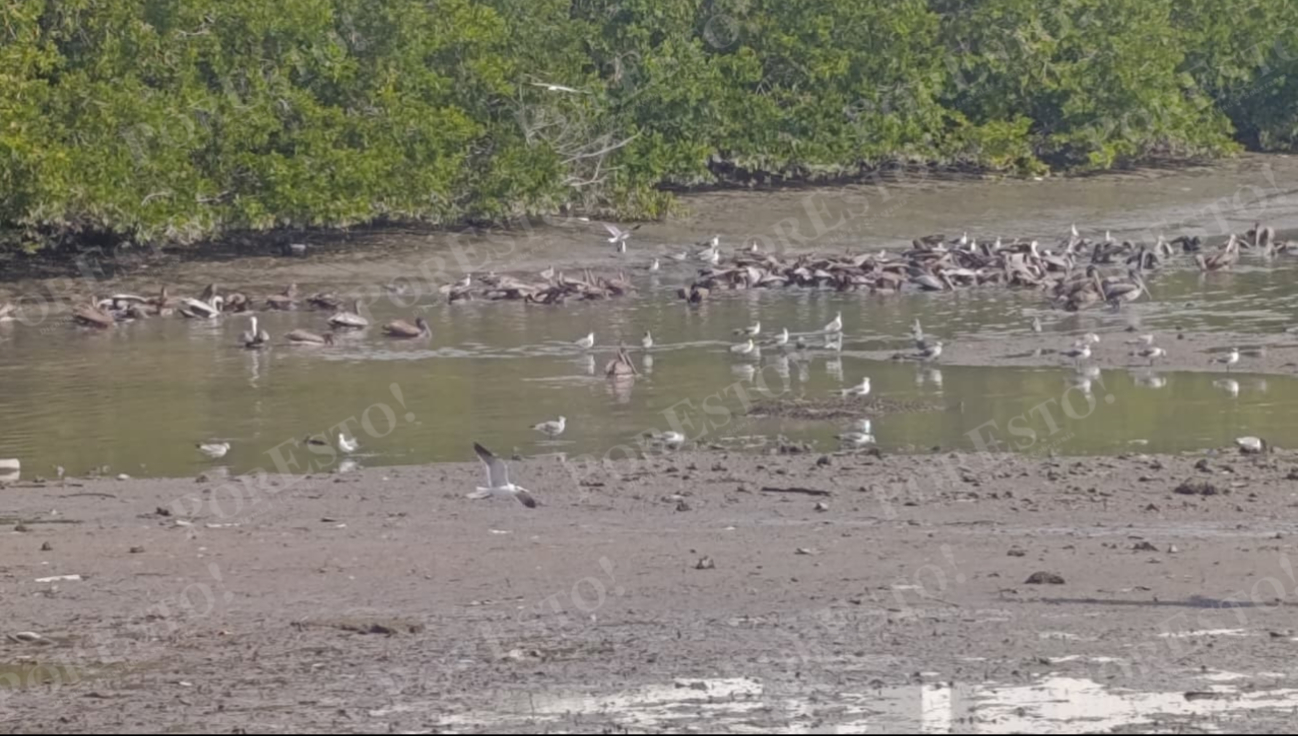 Desde el muelle del 7 de agosto destaca que el nivel del mar descendió, por lo que diferentes especies de aves aprovechan para atrapar los pescados que quedaron atrapados.