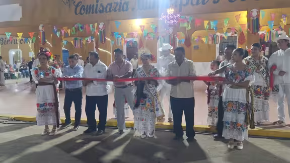 El presidente de la asociación de palqueros Salvador Pech, Clemente Sima, quienes tuvieron el honor de coronar a la reina la colocación de la banda y la corona quien encabezara las actividades religiosas y taurinas y en su costado estuvo la señorita Andrea Mian Moo embajadora de la feria de Pocboc 2025 quienes se encargaron del corte del listón inaugural