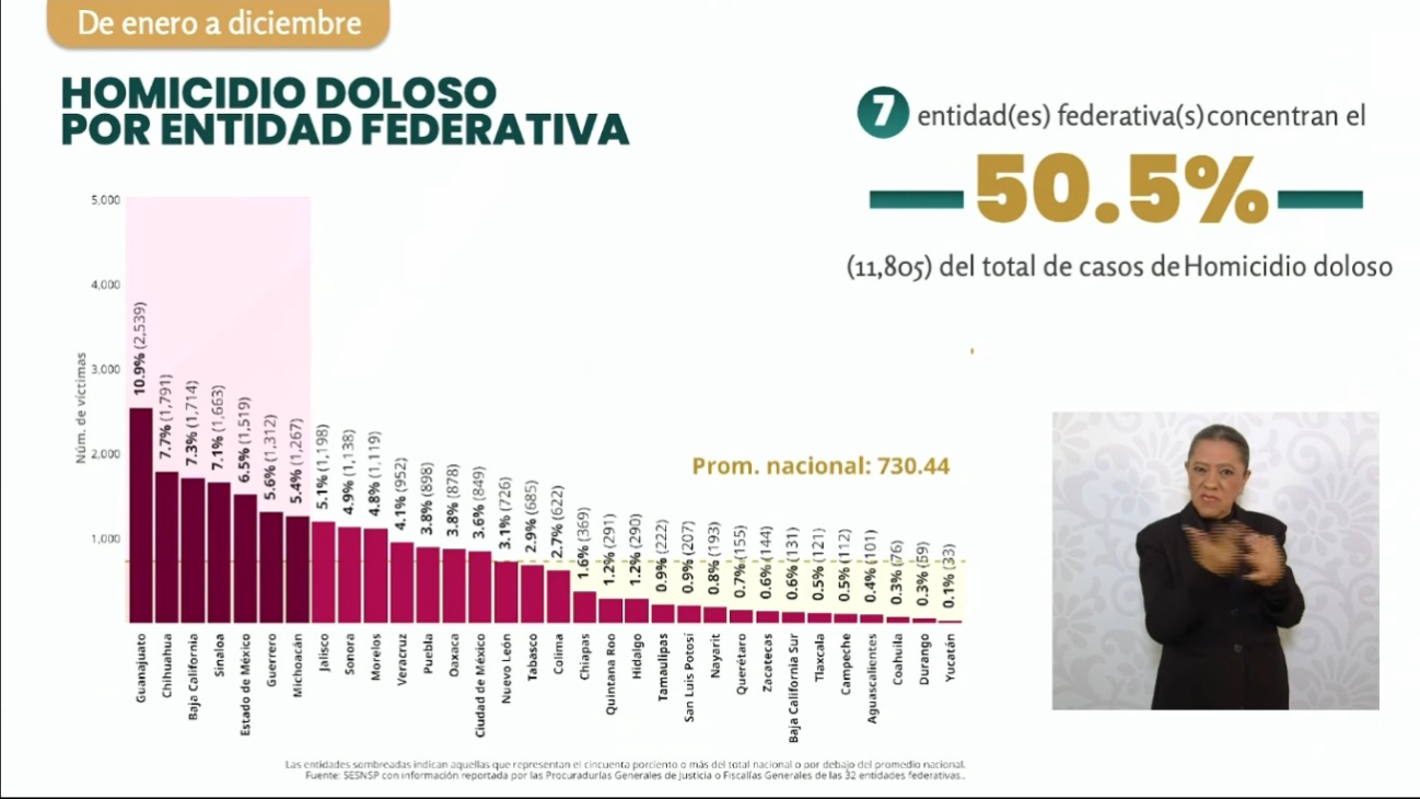 A nivel nacional la entidad con menos carpetas de investigación fue Yucatán, que registró 32 casos de homicidios dolosos en todo 2025. Por el contrario, la entidad con mayor número de registros fue Guanajuato, con un reporte e 2 mil 539 asesinatos.