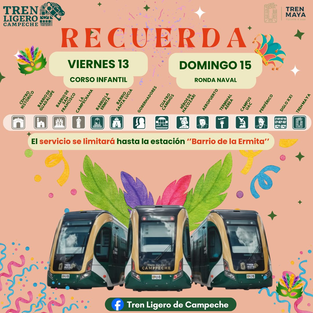 Con motivo de las actividades del Carnaval de Campeche 2026, el servicio del Tren Ligero tendrá modificaciones en sus rutas y horarios los días 13, 14 y 15 de febrero, con el objetivo de facilitar la movilidad y garantizar la seguridad de los asistentes.