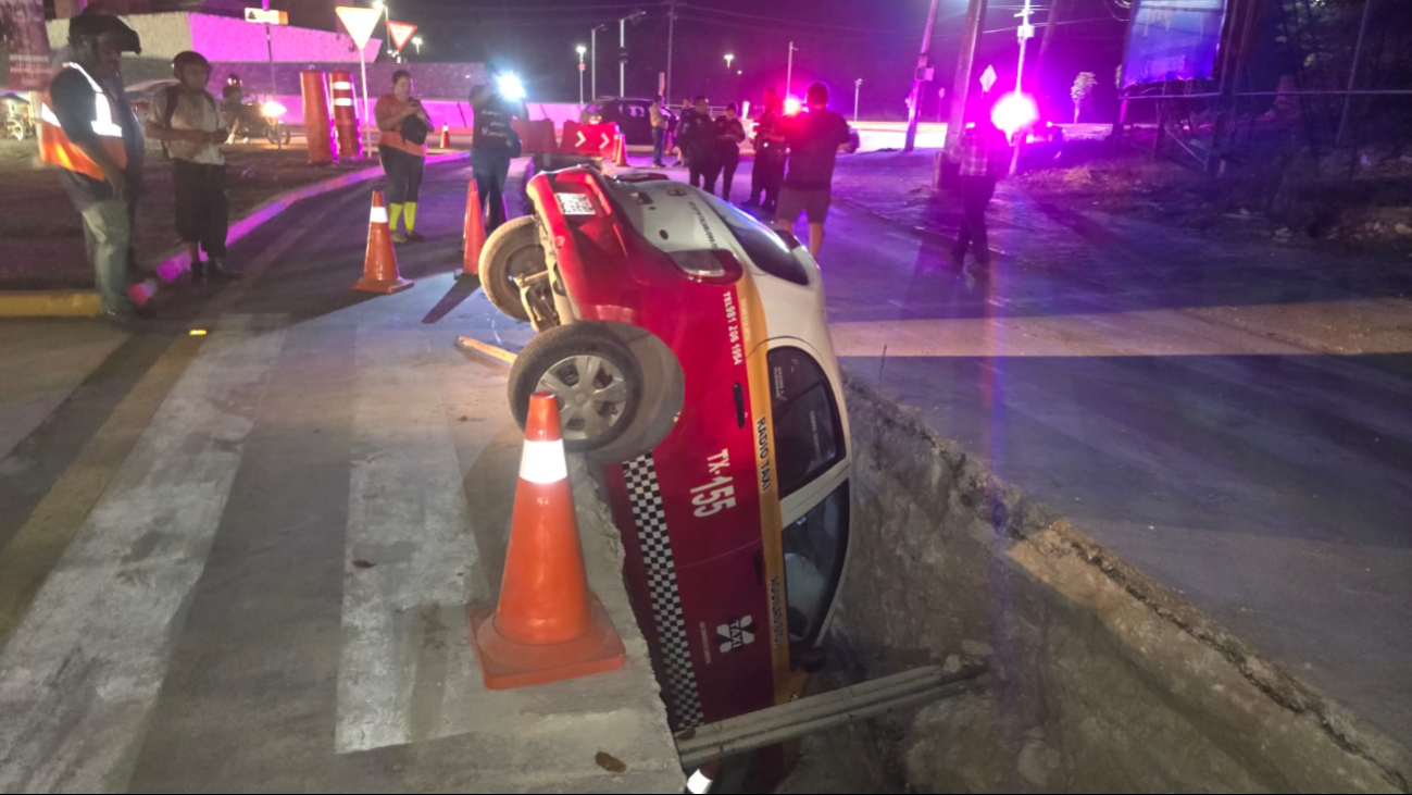 El conductor de la unidad de taxi número 155 perteneciente a la compañía Águilas, con placas del Estado de Campeche A-906-BEE, que presuntamente se encontraba bajo los efectos de sustancias etílicas, se desvió sobre un paso peatonal del área y, afectado igualmente por la escasa iluminación en la zona de construcción, terminó incrustado dentro de una zanja de alrededor de dos metros de profundidad.