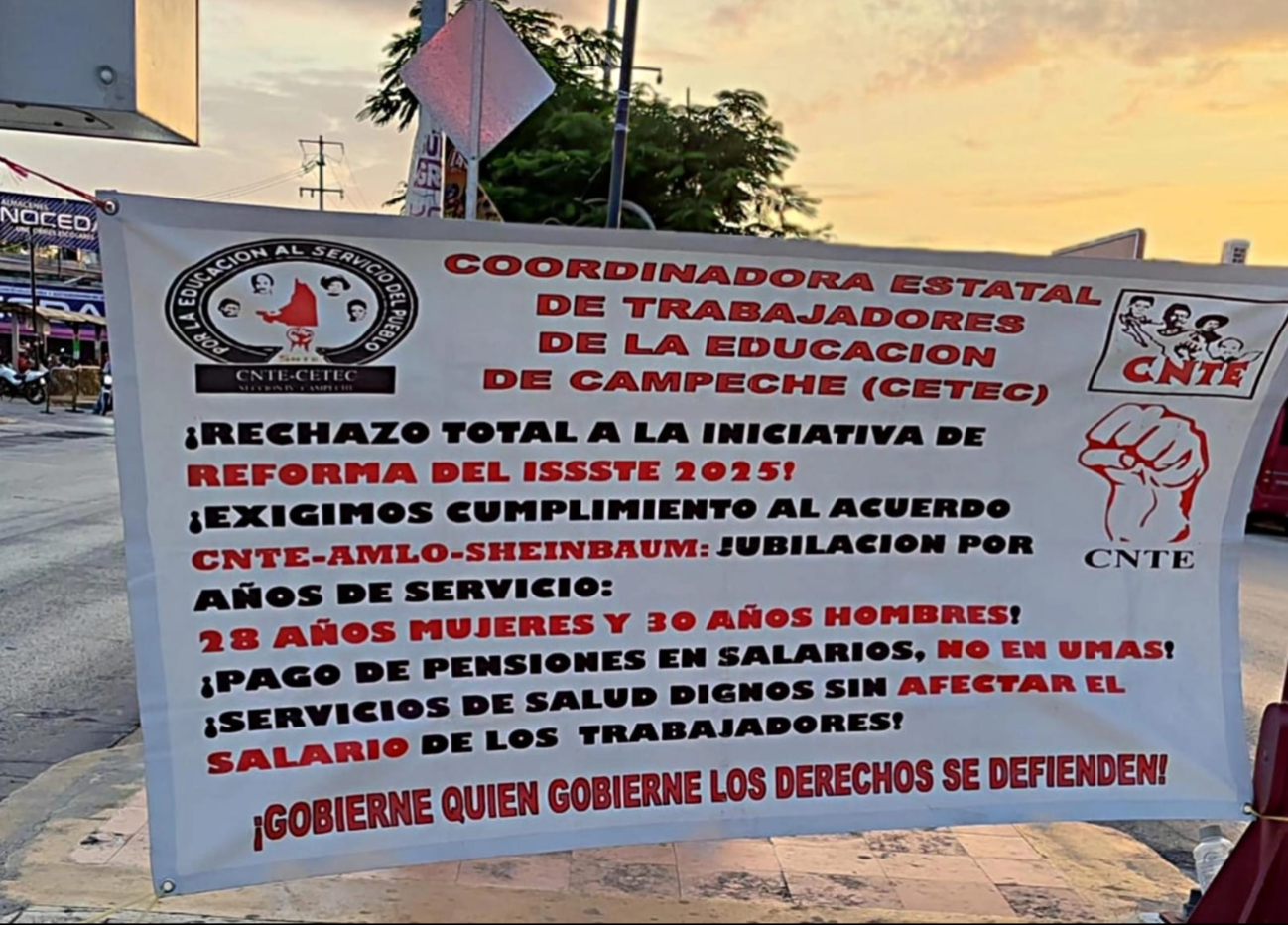 Miembros de la Coordinadora Estatal de Trabajadores de la Educación de Campeche realizaron una protesta pacífica sobre la avenida Circuito Baluartes, frente al mercado principal Pedro Sainz de Baranda, como muestra de solidaridad y unión al paro nacional del CNTE, el cual exige el cumplimiento del acuerdo de pagos justos por jubilaciones, pensiones y salarios respecto a los años de servicio.