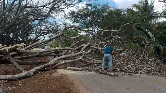 Un árbol de flamboyán cayó sobre la carretera federal 261 Hopelchén–Campeche, en San Francisco Suc Tuc, tras ser debilitado por un incendio. El tráfico quedó paralizado casi dos horas.