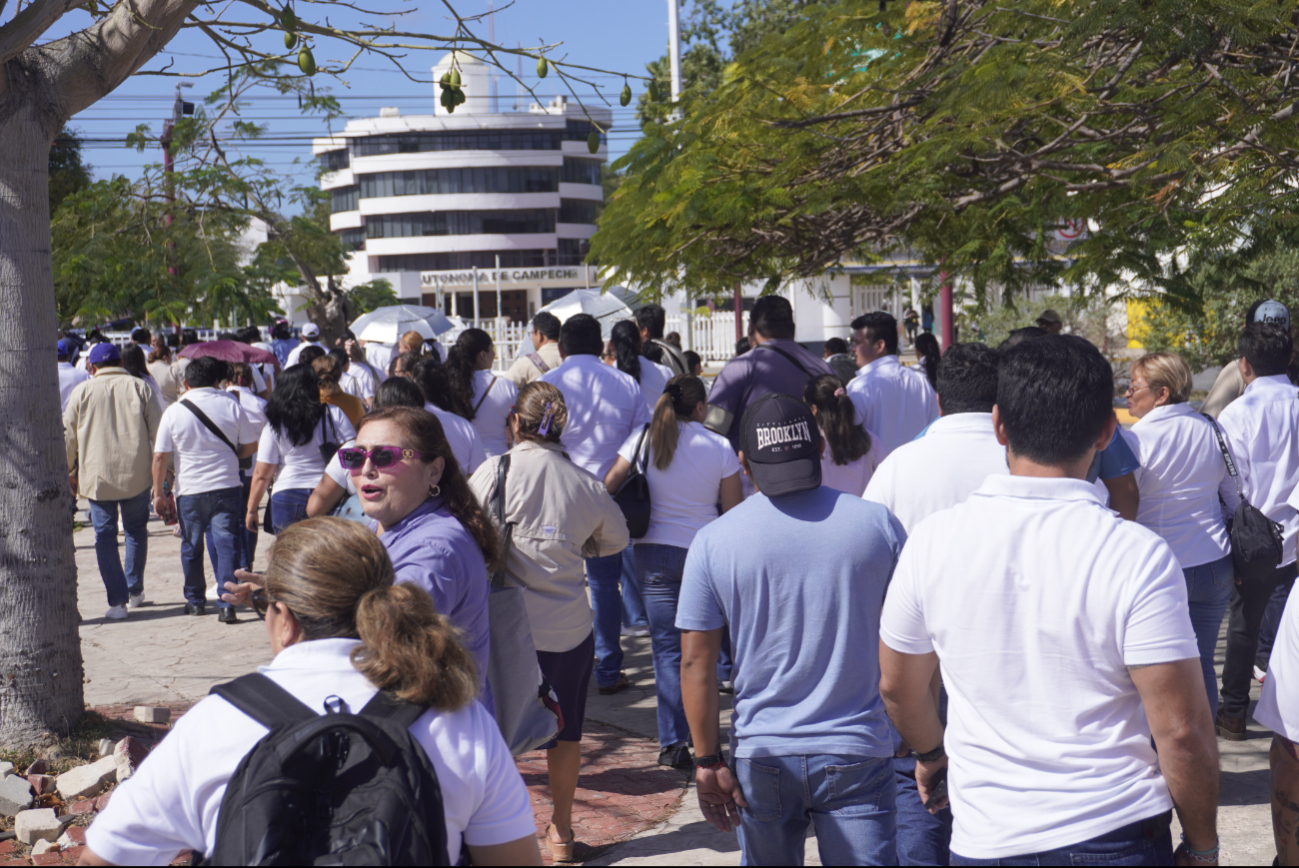Agremiados al Sindicato Único de Trabajadores Administrativos, de Intendencia y Similares de la Universidad Autónoma de Campeche (Sutaisuac) marcharon hacia la rectoría para manifestar su inconformidad ante presuntas irregularidades en la aplicación del reglamento de prestaciones sociales de la institución.