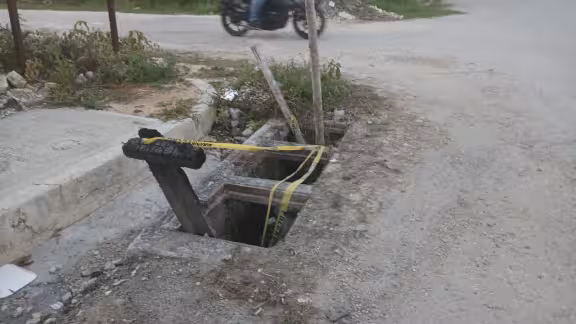 Colonos colocan cinta y madera para señalar riesgo en alcantarilla de Campeche