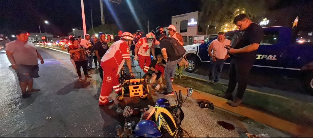 Pareja de motociclistas resultó lesionada tras ser impactada por una camioneta en avenida Isla de Tris, en Campeche. / Especial