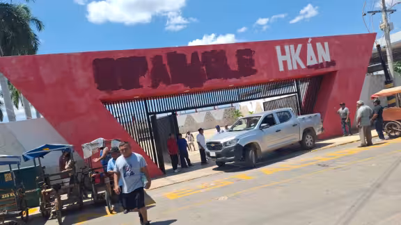 Un centenar de campesinos acudió este domingo a la unidad deportiva de Xcalumkin para borrar el logotipo “Imparable”, colocado por la actual administración en la entrada del estadio. Los ejidatarios manifestaron su repudio contra las decisiones del edil Cevastian Yam Poot, a quien acusan de ignorar acuerdos y evadir el diálogo.