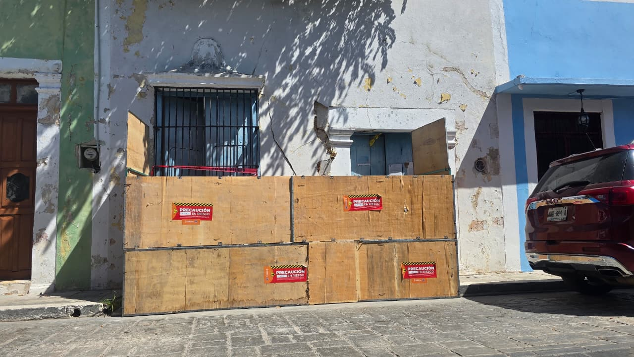 En el Centro Histórico de Campeche, una casona abandonada está en riesgo de derrumbe. Protección Civil colocó sellos de precaución y notificó a la propietaria. Vecinos piden atención urgente.