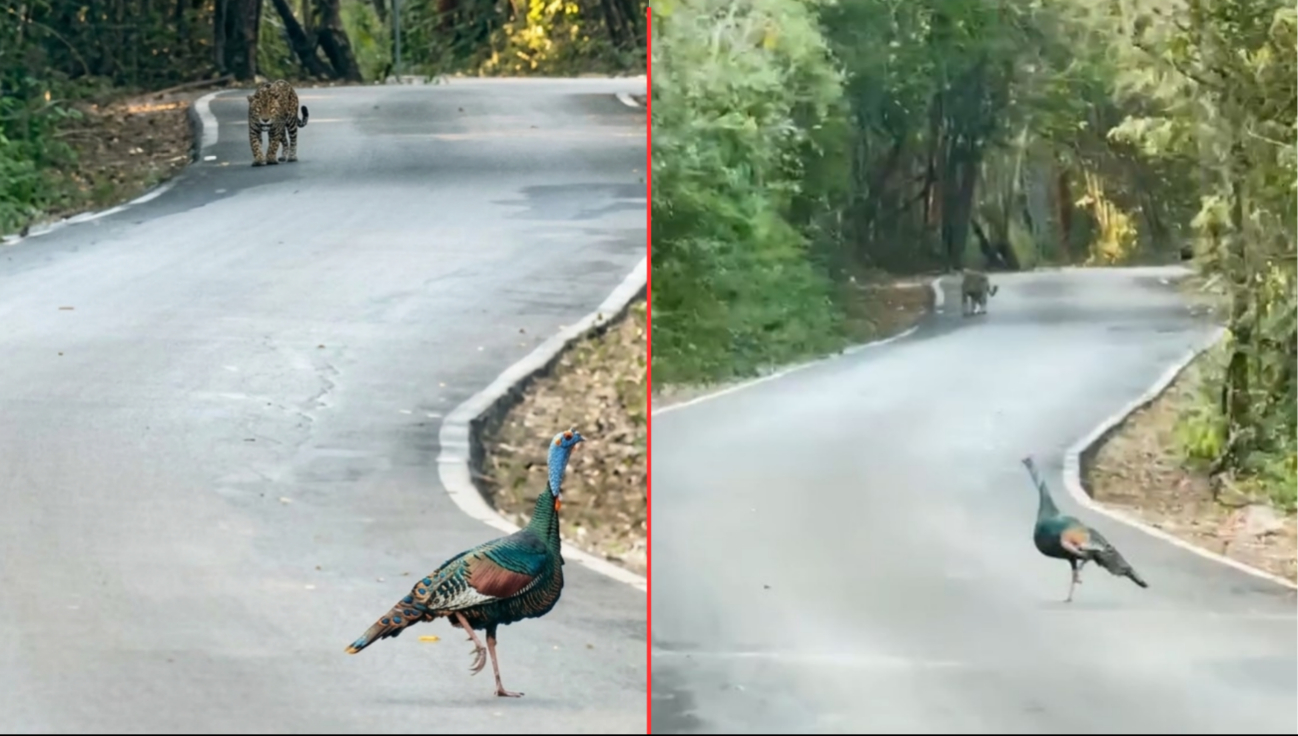 Guías locales de la Reserva de la Biosfera de Calakmul captaron un momento único y poco común: un jaguar adulto observando detenidamente a un pavo ocelado mientras ambos se encontraban sobre la misma carretera rodeada de selva.