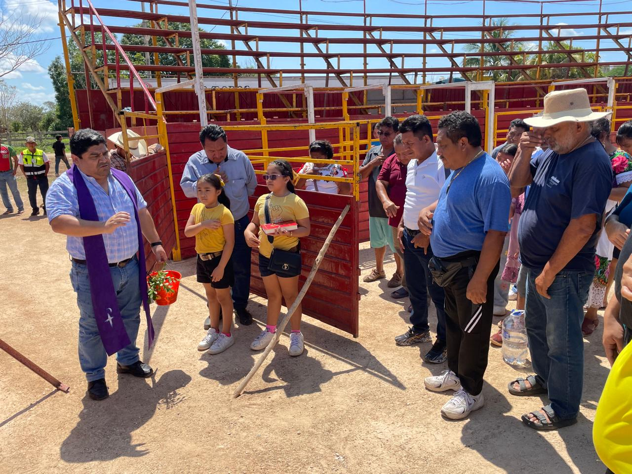 La mañana de jueves, el sacerdote David Vivas Hernández, párroco de la Iglesia de San Antonio de Padua de Hopelchén, bendijo el ruedo taurino portátil en donde se realizarán los shows cómicos, charlotadas y corridas de postín durante la Feria de la Miel y el Maíz 2026.