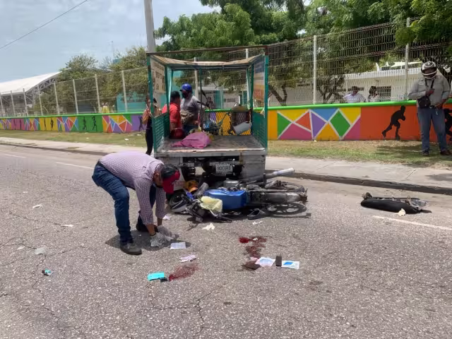 Dos hombres resultaron gravemente lesionados; uno de ellos con la pierna completamente destrozada luego del impacto de una motocicleta contra la parte trasera de una moto carro en la colonia Plutarco Elías Calles, en Ciudad del Carmen; por el fuerte accidente los lesionados fueron llevados a un centro médico mientras que los hechos fueron remitidos al ministerio público.