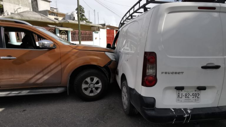 Dos camionetas colisionaron en el semáforo de cortesía del uno por uno en calles de la colonia tila; tras el percance, una de las camionetas término montada a la banqueta golpeando la barda de un domicilio; los involucrados decidieron dar parte a sus respectivas aseguradoras para llegar a un favorable acuerdo por el pago de daños.