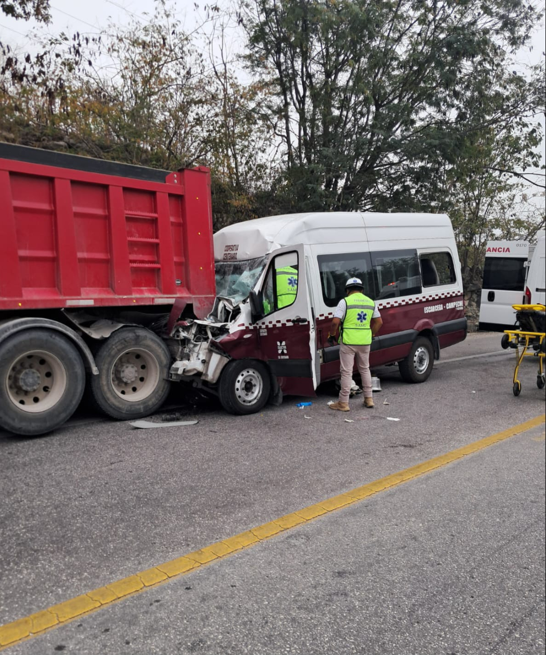 Accidente en la carretera Escárcega–Champotón: combi choca contra camión volteo. Varias personas lesionadas, todas estables.