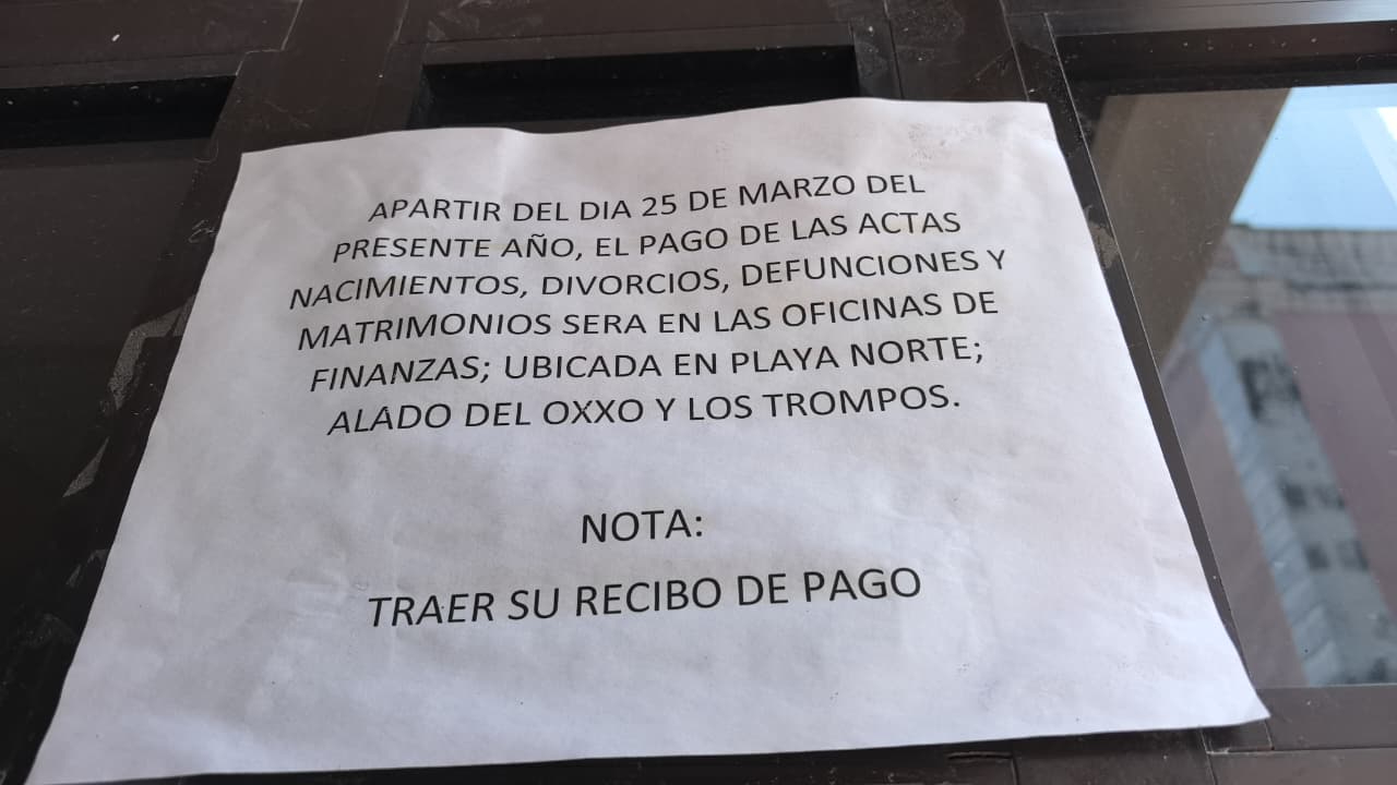 Detalló que actualmente el costo por la expedición de actas —ya sea de nacimiento, matrimonio, defunción o divorcio— es de 123 pesos, tarifa oficial que se aplica de manera uniforme. Respecto a las molestias ciudadanas, Zavala Martínez reconoció que uno de los principales inconvenientes es la falta de una caja de la SEAFI en las instalaciones del Registro Civil, lo que obliga a los usuarios a trasladarse a otro punto como la sede en “Playa Norte” para realizar sus pagos, lo que enoja al usuario porque el Registro Civil está en el Centro.