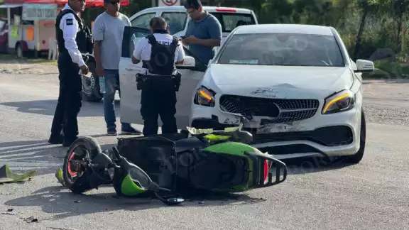 La mañana de este martes se registró un aparatoso accidente sobre la carretera Carmen–Puerto Real, a la altura del kilómetro 10 y justo frente al fraccionamiento Misión del Carmen, donde un motociclista resultó lesionado de manera leve y se generaron considerables daños materiales que afectaron momentáneamente la circulación vehicular en la zona.