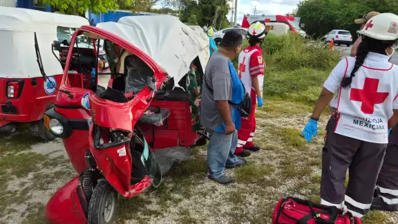 De acuerdo con los primeros informes recabados en el lugar, el accidente involucró a un pochimóvil color rojo, marca Piaggio, con placas de circulación 18GUE4 del estado de Campeche, perteneciente al sindicato “La Ilusión”. La pequeña unidad terminó volcada sobre la cinta de rodamiento tras ser impactada por una camioneta que era conducida por una mujer y que circulaba con preferencia sobre la vía federal.