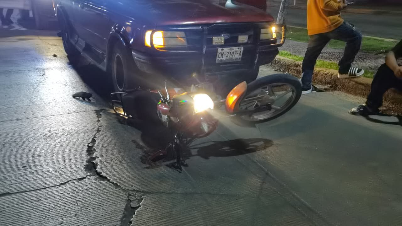 Un accidente de tránsito se registró en el fraccionamiento Reforma, donde una motocicleta particular terminó debajo de una camioneta de batea, sin que afortunadamente se reportaran personas lesionadas de gravedad.
