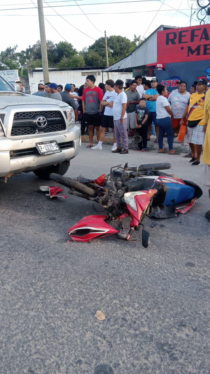 Una motocicleta Italika AT110RT y una camioneta Toyota Hilux, ambas con placas del Estado de Campeche, protagonizaron un hecho de tránsito por la colonia Tizimín, en Seybaplaya.