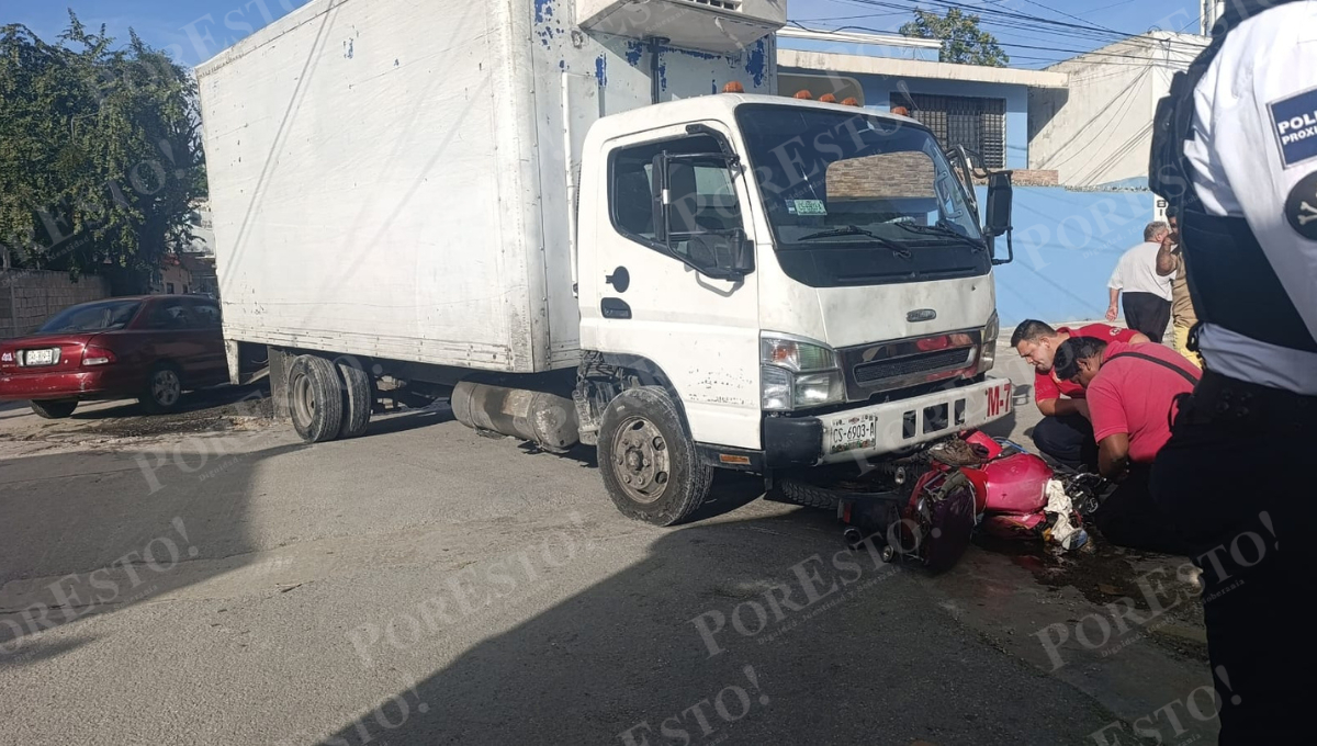 Camión arrolla y arrastra motocicleta en Santa Lucía, Campeche; hay dos lesionados