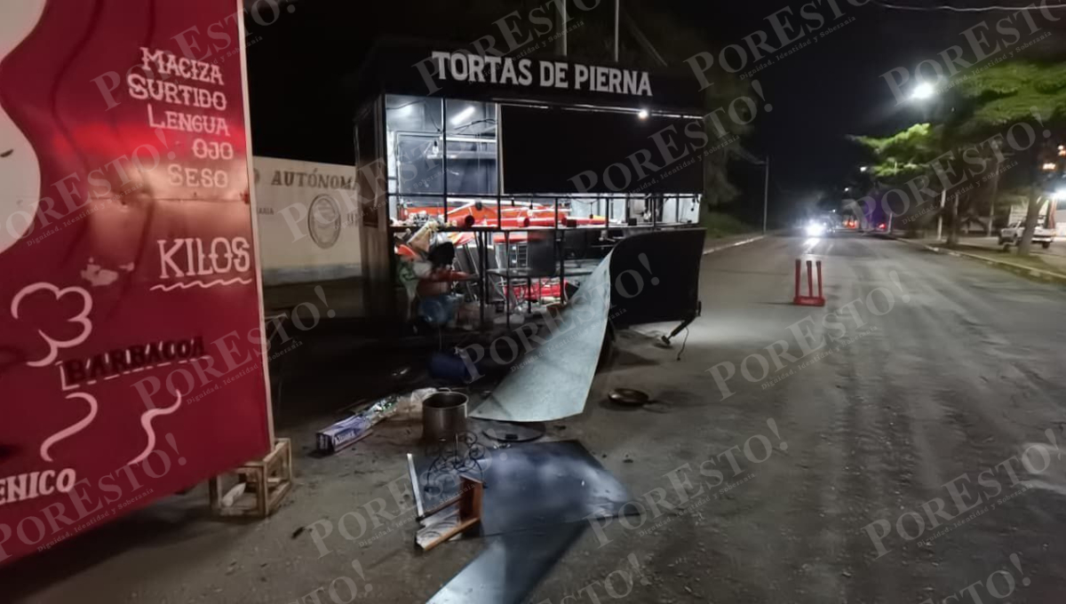 Un fuerte accidente de tránsito se registró durante la madrugada en el fraccionamiento Mundo Maya, luego de que el conductor de una camioneta, presuntamente en estado de ebriedad, impactara violentamente contra un remolque de comida que se encontraba estacionado sobre la avenida principal, para posteriormente darse a la fuga.