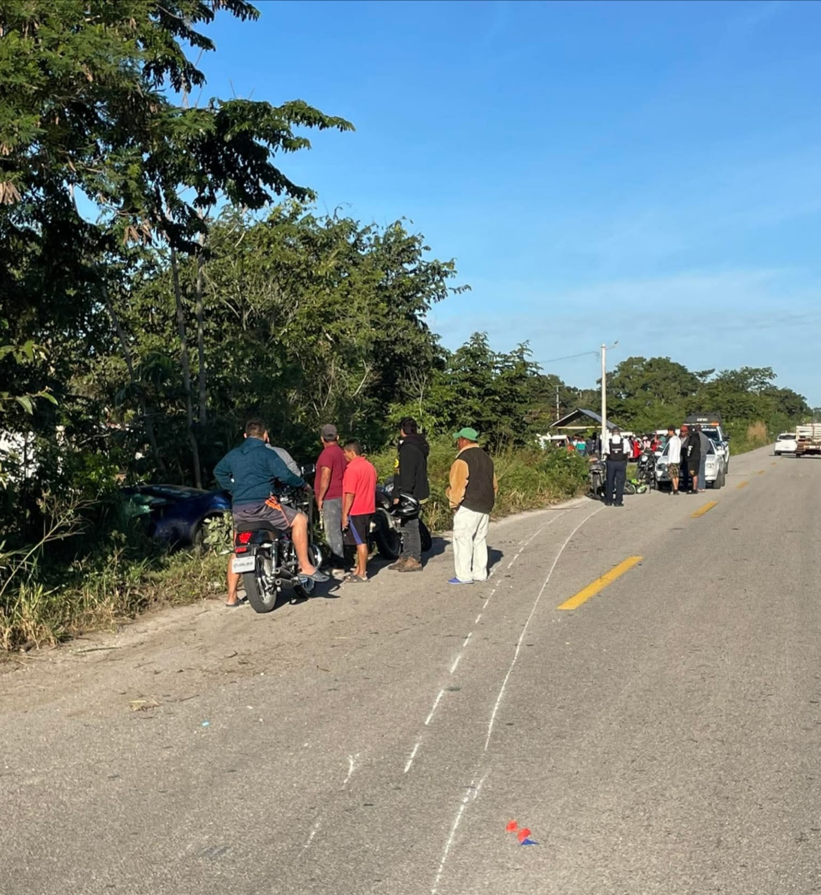 Pobladores de Chekubul que vieron lo que ocurrió dijeron que un camión de refrescos se les cerró a los conductores de la camioneta y la motocicleta y provocó que se salieran de la carretera y quedaran en el monte.