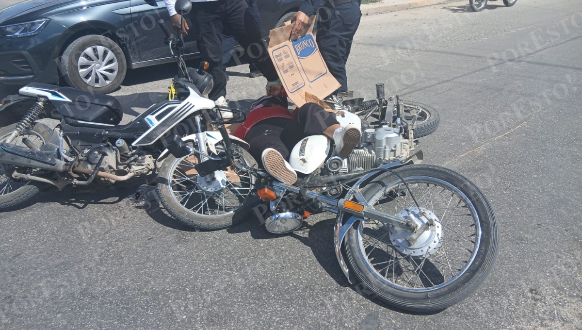 Una joven mujer que conducía una motocicleta Honda color blanco, placa 66GPE7 del estado, resultó con golpes en la espalda, luego de ser impactada por otra motocicleta Italika color blanco, sin placa, conducida por un joven, en la tarde cuando circulaban sobre la avenida Héctor Pérez Martínez, por calle 39 de la colonia Morelos. Fue atendida por personal del Sistema de Atención Médica de Urgencias (SAMU) y trasladada al hospital IMSS-Bienestar Janell Romero Aguilar. Tomaron conocimiento elementos de la Secretaría de Protección y Seguridad Ciudadana (SPSC).