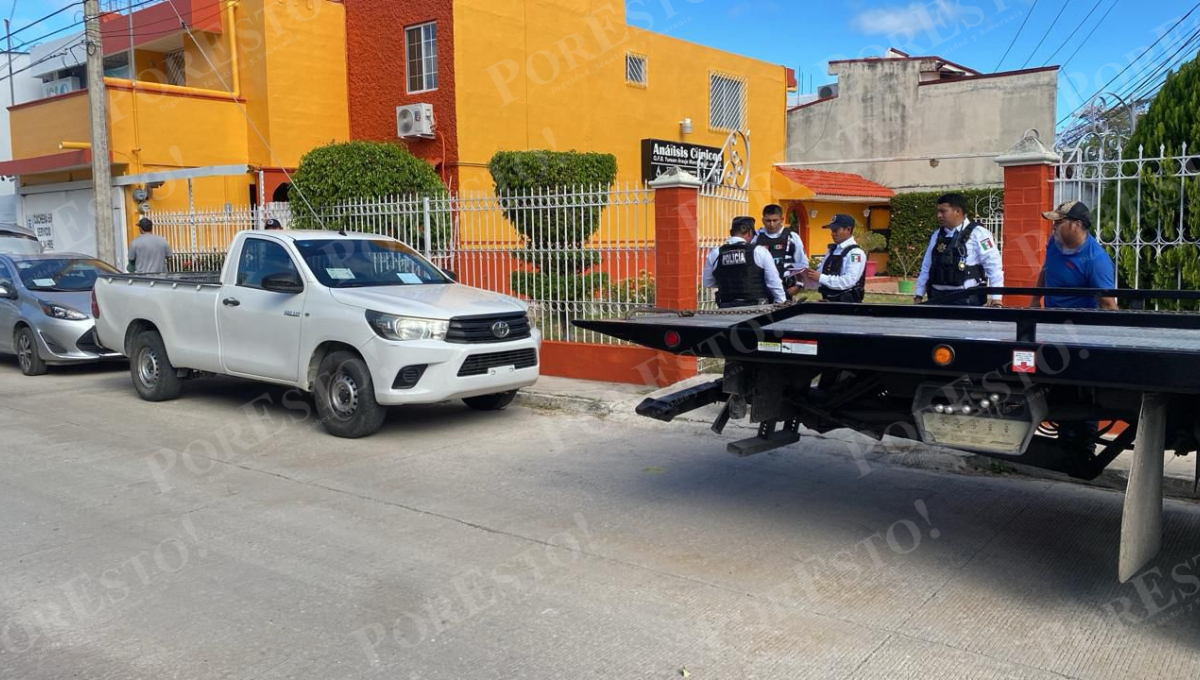 Varias patrullas rodearon una camioneta blanca sin placas en la unidad habitacional Flor de Limón, la cual fue estacionada en el acceso a un consultorio privado. La unidad fue analizada para descartar su relación con algún hecho delictivo, mientras el dueño se encontraba comprando comida a unos metros del lugar.