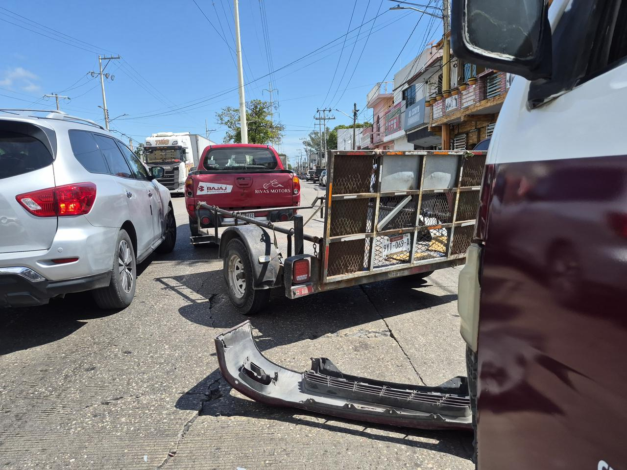 Según versiones recabadas en el lugar, todo indica que durante la maniobra de circulación, el remolque jalado por la camioneta Mitsubishi se trabó en la defensa delantera de la Combi. La fricción generada derivó en que la pieza fuera arrancada por completo, ocasionando daños visibles a la unidad de transporte público.