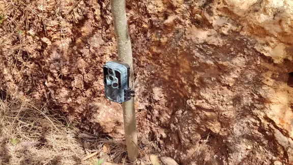 La primera cámara localizada era de la marca Wosports Modelo G600 4K, amarrada a un árbol de jabín con un clavo, justo antes de pasar el puente del Tren Maya. No se sabe cuánto tiempo llevaba en el sitio ni si su contenido fue formateado desde algún dispositivo móvil o computadora.