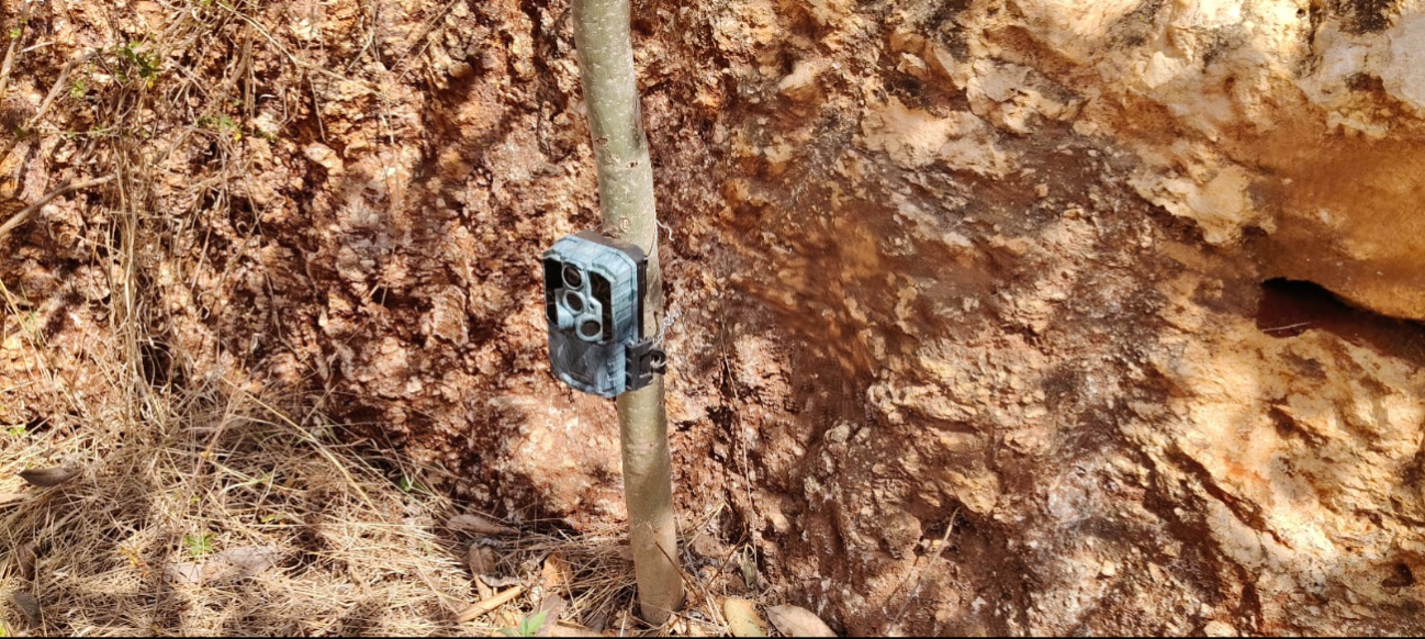 La primera cámara localizada era de la marca Wosports Modelo G600 4K, amarrada a un árbol de jabín con un clavo, justo antes de pasar el puente del Tren Maya. No se sabe cuánto tiempo llevaba en el sitio ni si su contenido fue formateado desde algún dispositivo móvil o computadora.