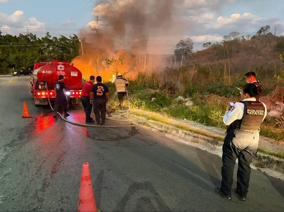 Esta tarde se registró un incendio de maleza sobre la Avenida Baja Velocidad, en la Carretera Antigua Campeche, Mérida, presuntamente derivado de quemas de basura, lo que generó una intensa movilización por parte de la Secretaría de Protección Civil del Estado de Campeche (Seprocicam), así como de la Policía Estatal (PE) y el cuerpo de Bomberos de la ciudad.