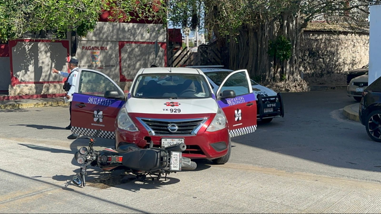Un hecho de tránsito se registró la tarde de este día en el barrio de Guadalupe, en la ciudad de Campeche, luego de que un taxi presuntamente no respetara su alto obligatorio en el cruce de las calles 14 y 49B, impactando a una pareja que viajaba a bordo de una motocicleta.