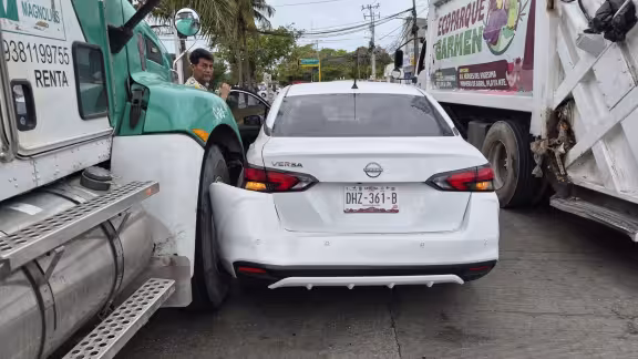 Tras la colisión, el automóvil terminó incrustado en las llantas delanteras de la unidad pesada, resultando con severos daños en la defensa y la salpicadera. A pesar de lo aparatoso del accidente, no se reportaron personas lesionadas.