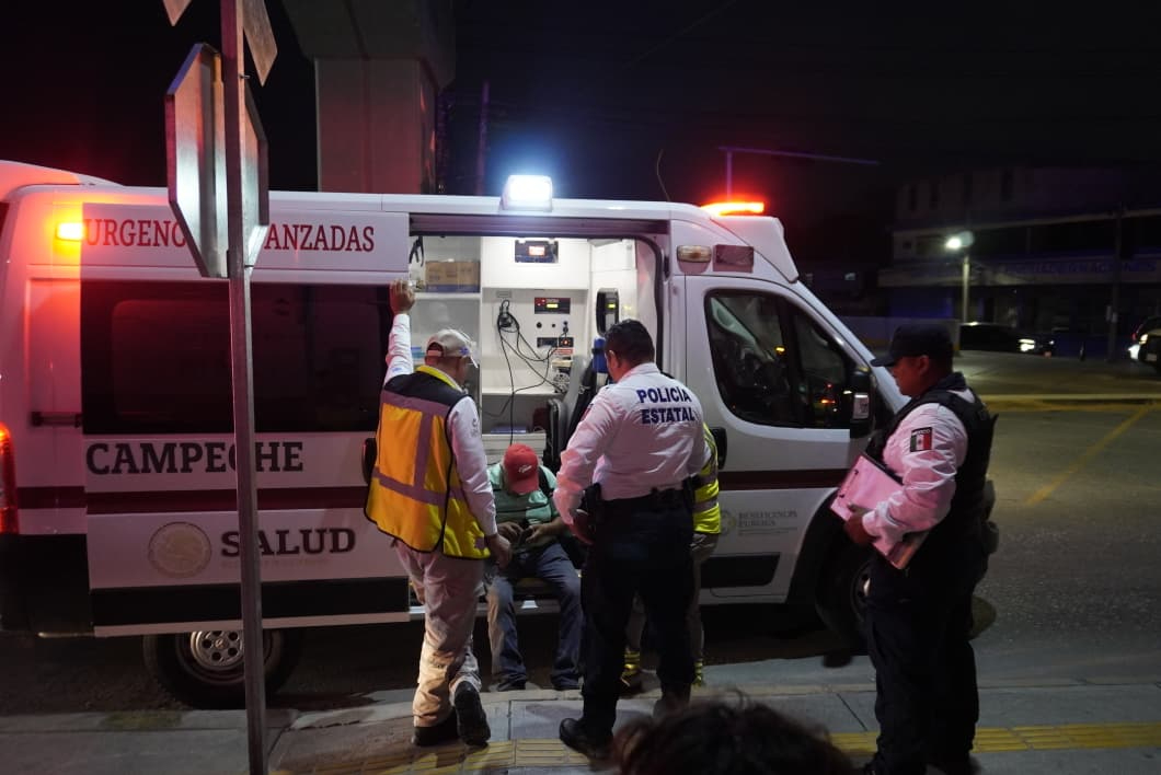 Un motociclista de la tercera edad resultó lesionado tras derrapar sobre la avenida Gobernadores en Campeche. Paramédicos del SAMU lo atendieron en el lugar y descartaron otro vehículo involucrado.