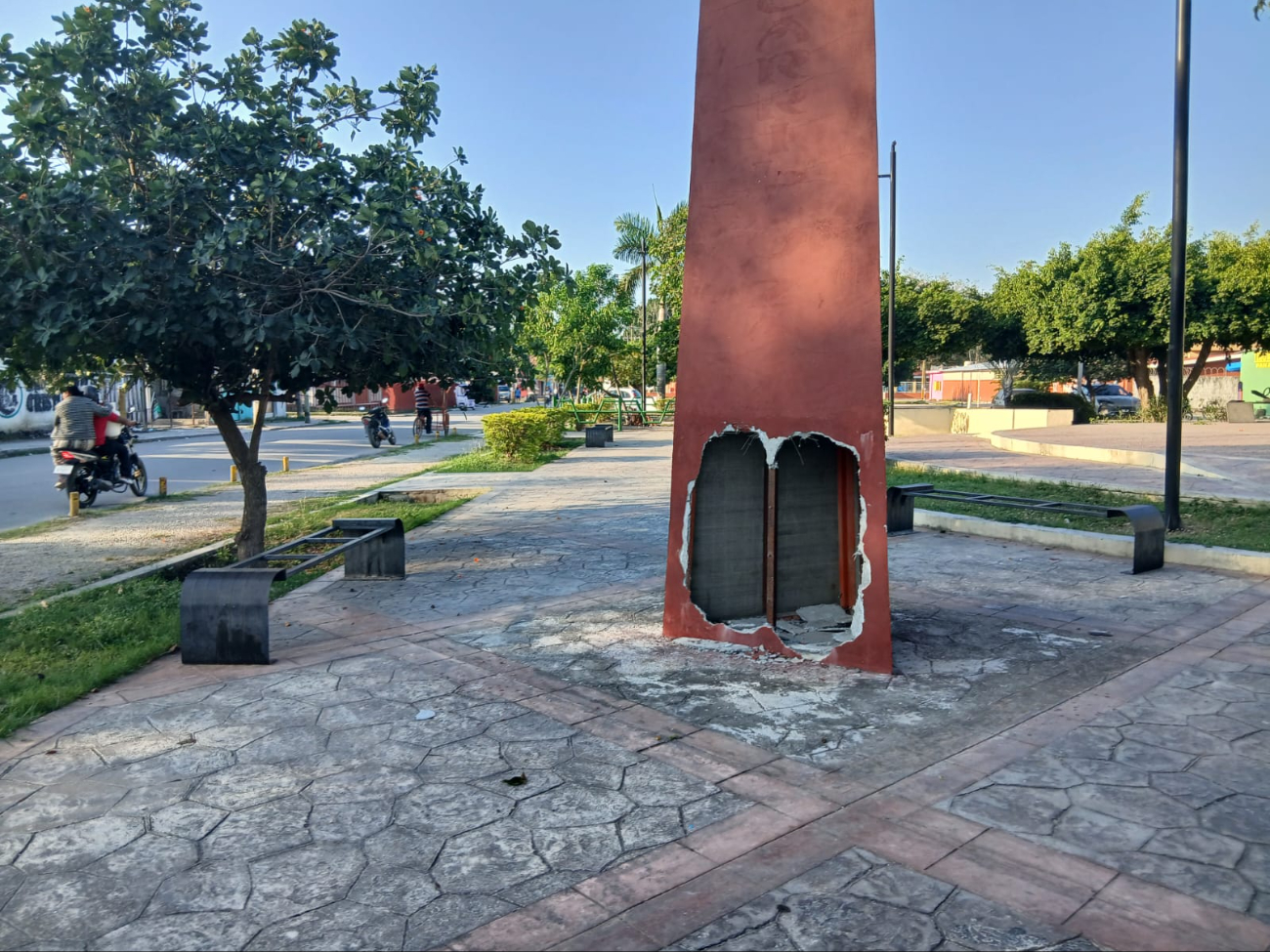 Esta mañana amaneció destrozada la parte inferior del Obelisco ubicado en el parque Abelardo Carrillo Zavala, sobre la calle 23 entre 24 y 26-A de la colonia Centro, sin que los vecinos se percataran del hecho. El daño habría sido ocasionado durante la madrugada por personas desconocidas que aprovecharon la oscuridad para cometer el acto vandálico.