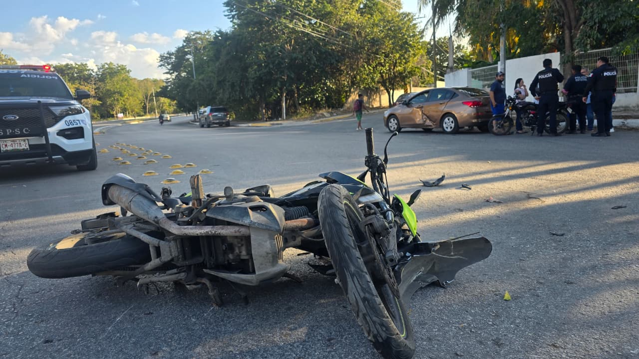 Motociclista se incrusta en auto en Campeche y rompe el cristal con la cabeza