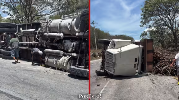 Un guiador de una unidad cargada con varas de caña perdió el control del volante al tomar una curva, lo que provocó una volcadura sobre la carretera federal Campeche–Seybaplaya.