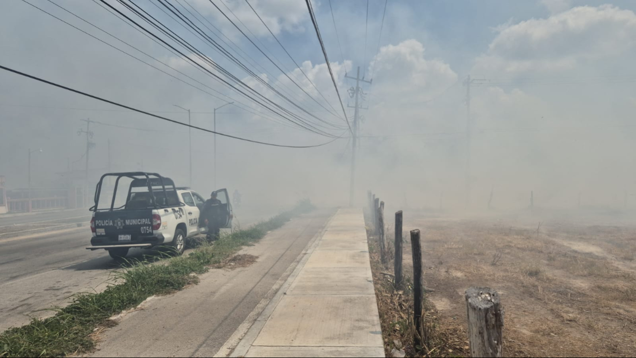 Incendio fuera de control en Las Brisas, Champotón, generó humo y movilizó a cuerpos de emergencia. Vecinos ayudaron a proteger viviendas; el fuego fue controlado.