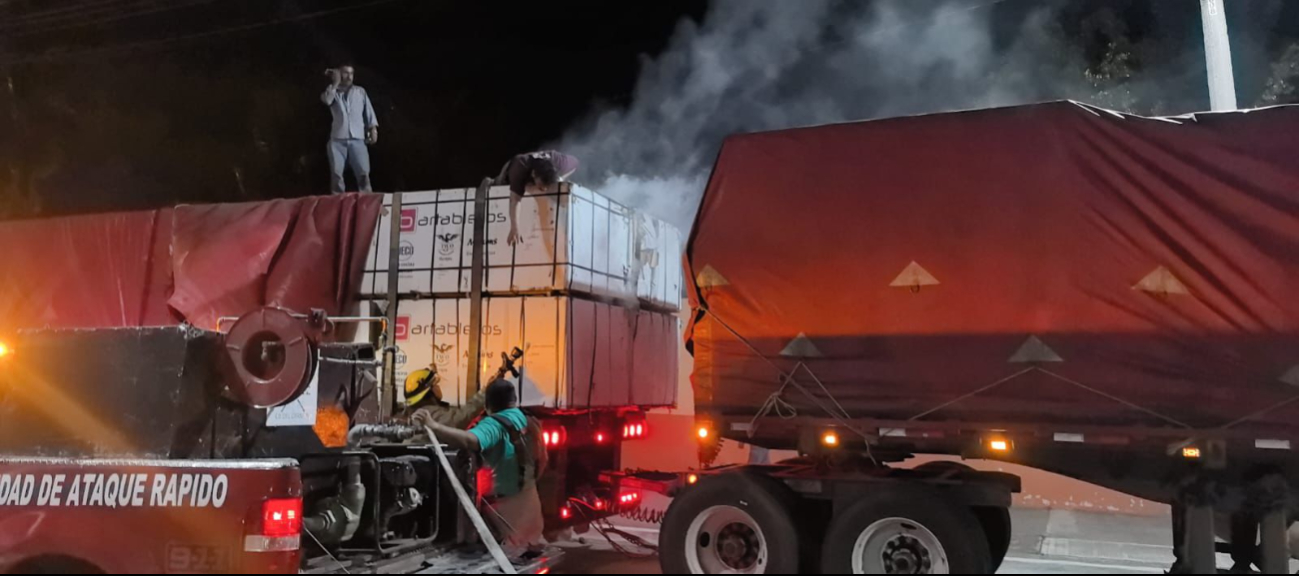 Al arribar al sitio, los rescatistas confirmaron que se trataba de una unidad pesada que trasladaba dos planas cargadas con cajas de triplay. De acuerdo con los primeros reportes, el siniestro se habría originado por la fricción entre la carga de madera y los cinchos de sujeción, lo que generó calor suficiente para iniciar el fuego.